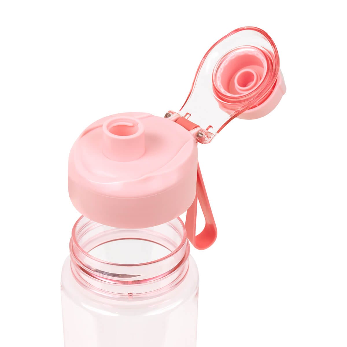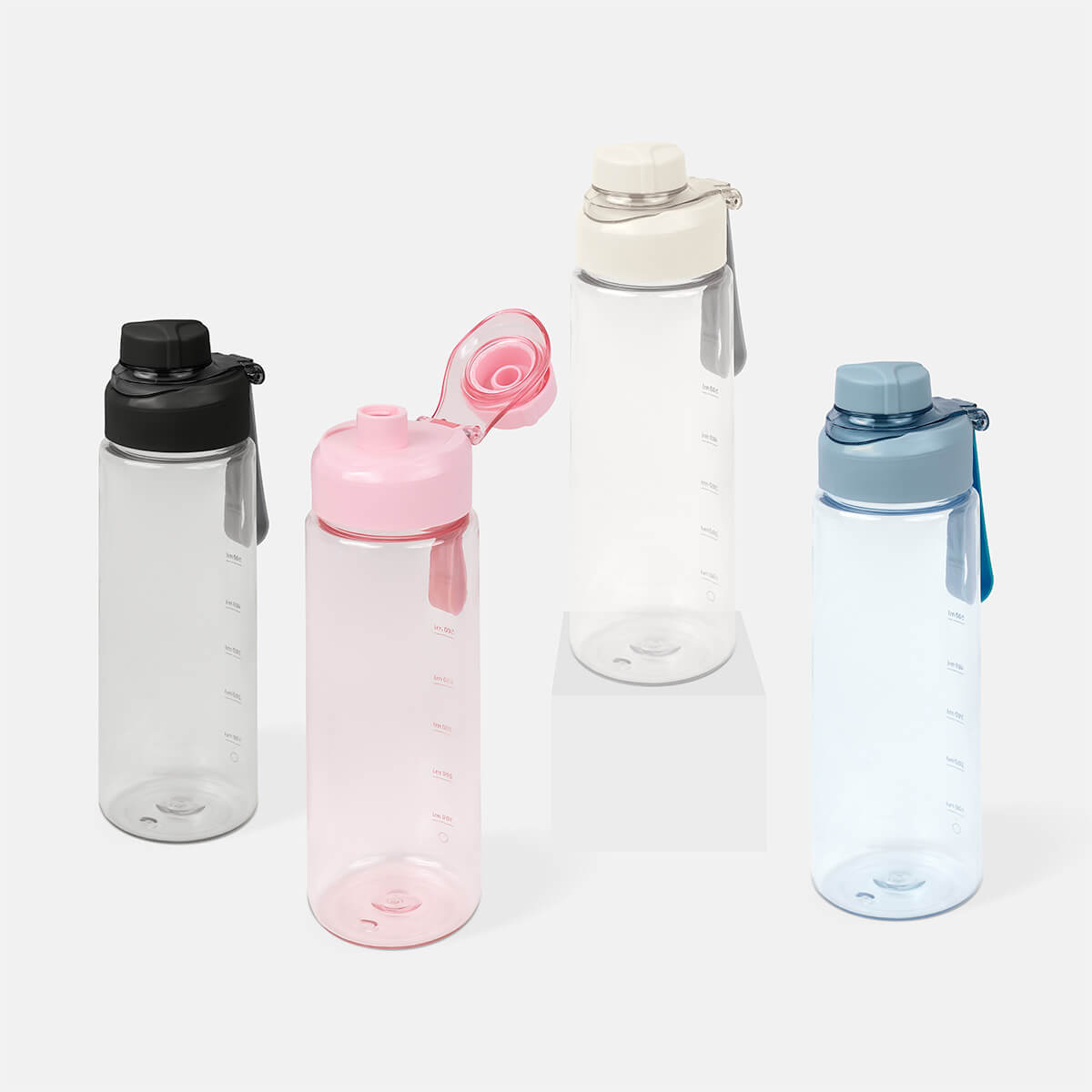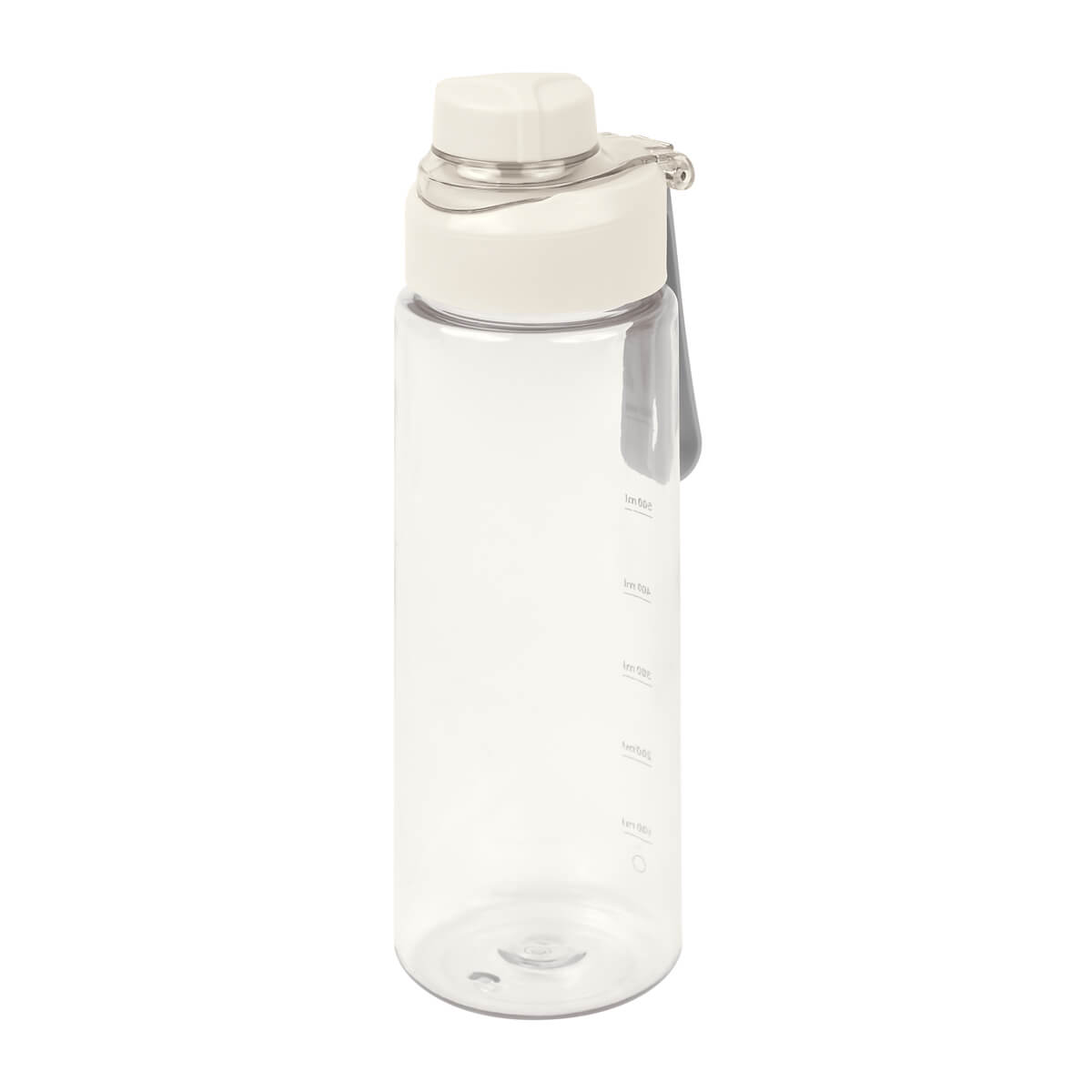 Cilindro de plástico de una pared. Tapa de plástico con sistema de rosca y sobretapa para la boquilla. Cuenta con asa de silicón para llevarlo cómodamente e indicador de mililitros. Perfecto para el día a día