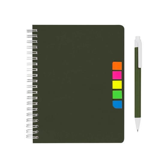 Libreta con 70 hojas de raya. Incluye banderillas adheribles de diferentes colores, bolígrafo ecológico y espiral metálico doble.