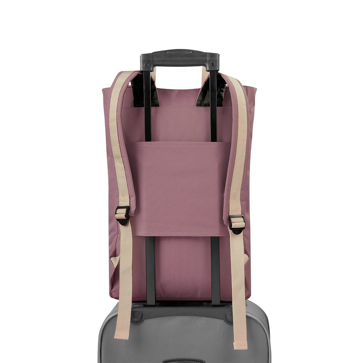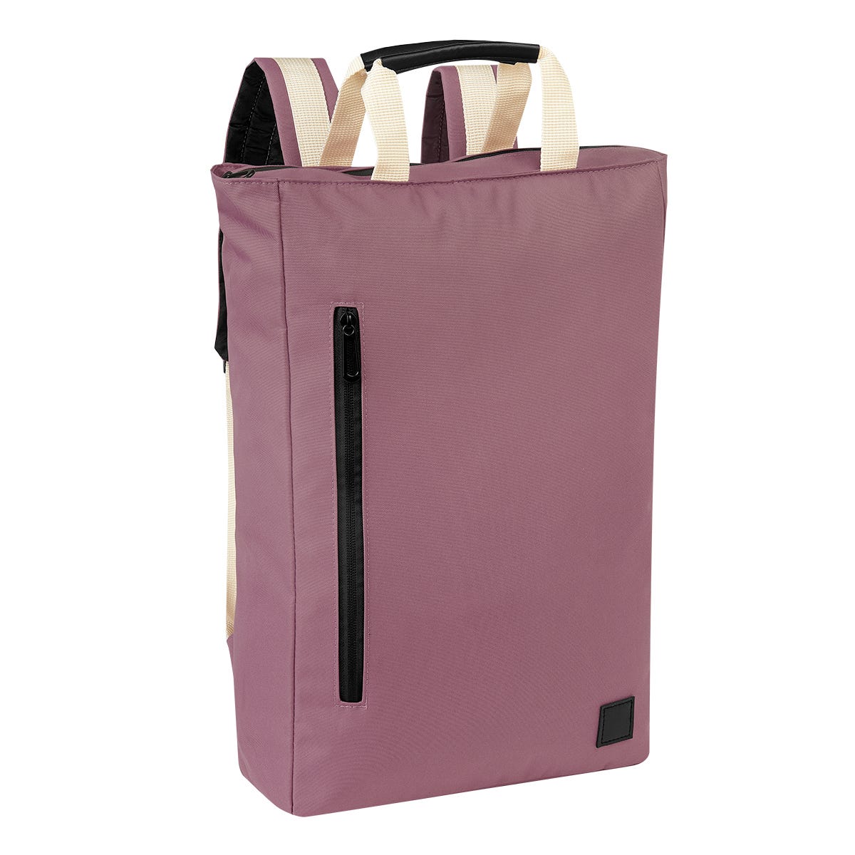 Mochila estilo casual. Compartimento principal con cierre y separador para laptop de hasta 14”. En la parte frontal dispone de un bolsillo con cierre vertical que lo hace funcional para llevar accesorios más pequeños y además le aporta un toque de diseño. Incluye dos asas superiores con recubrimiento de curpiel para mayor comodidad en su transportación. Cuenta con asas ajustables para hombro y banda trasera para utilizar en trolley, también funciona para guardar sus asas y utilizar como bolsa.
