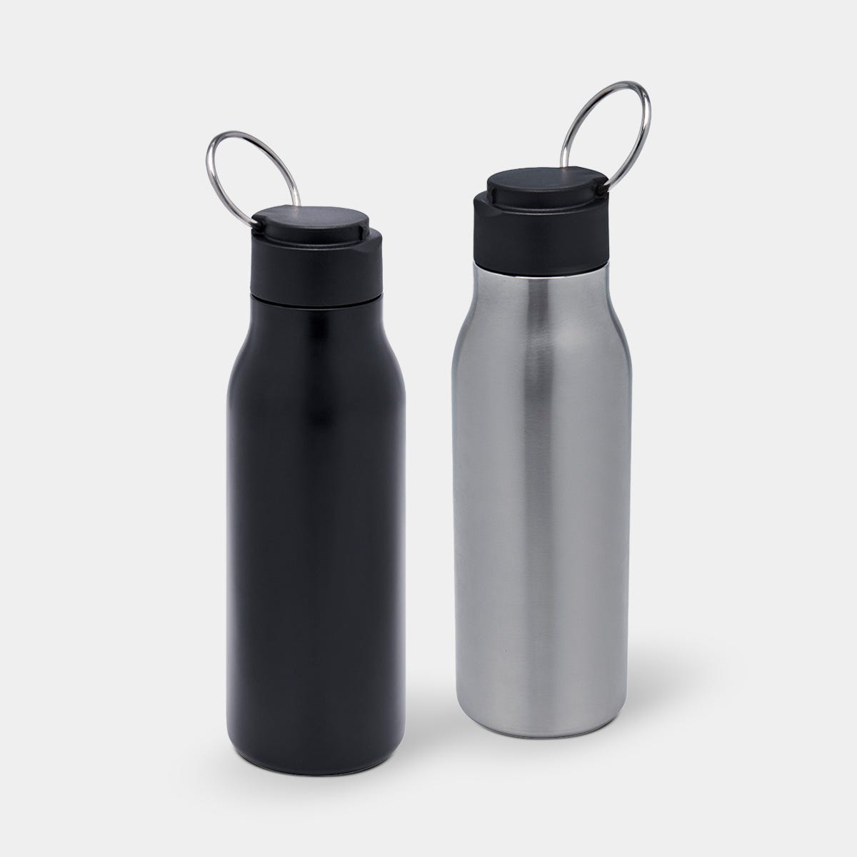 Cilindro metálico de una pared y tapa de plástico con cierre de rosca. Incluye aro metálico en la tapa que funciona como asa. Terminado mate.