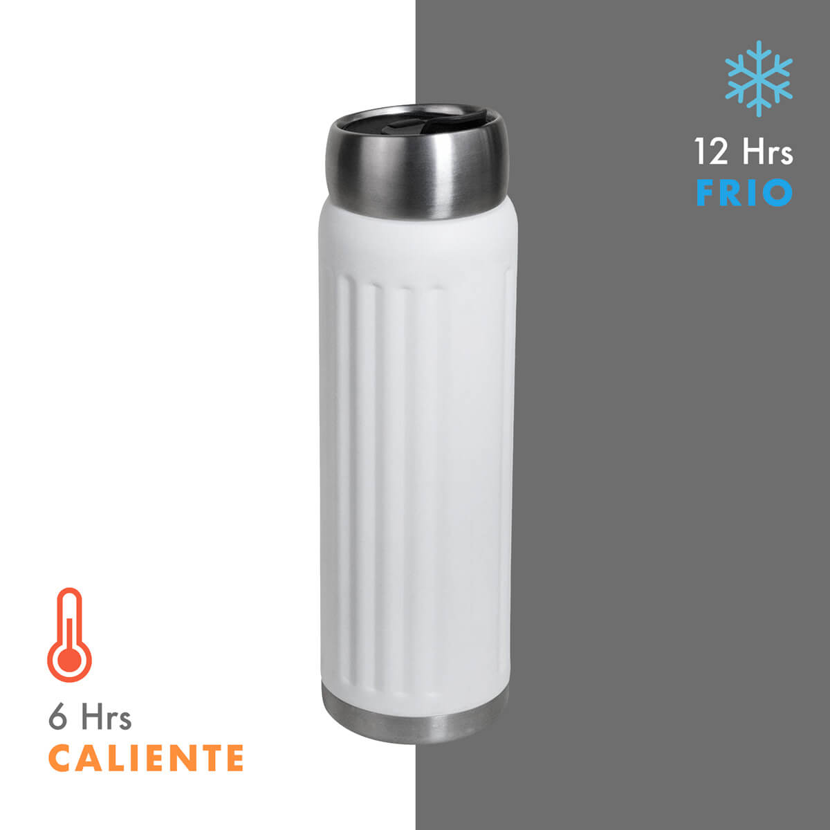 Doble pared. Cerrado al vacío. Pared interna y externa acero inoxidable. Tapa metálica con sistema de rosca. Sobre tapa de plástico con sistema de push. Terminado rugoso. Mantiene temperatura caliente 6 hrs y temperatura fría 12 hrs aproximadamente. Incluye caja individual