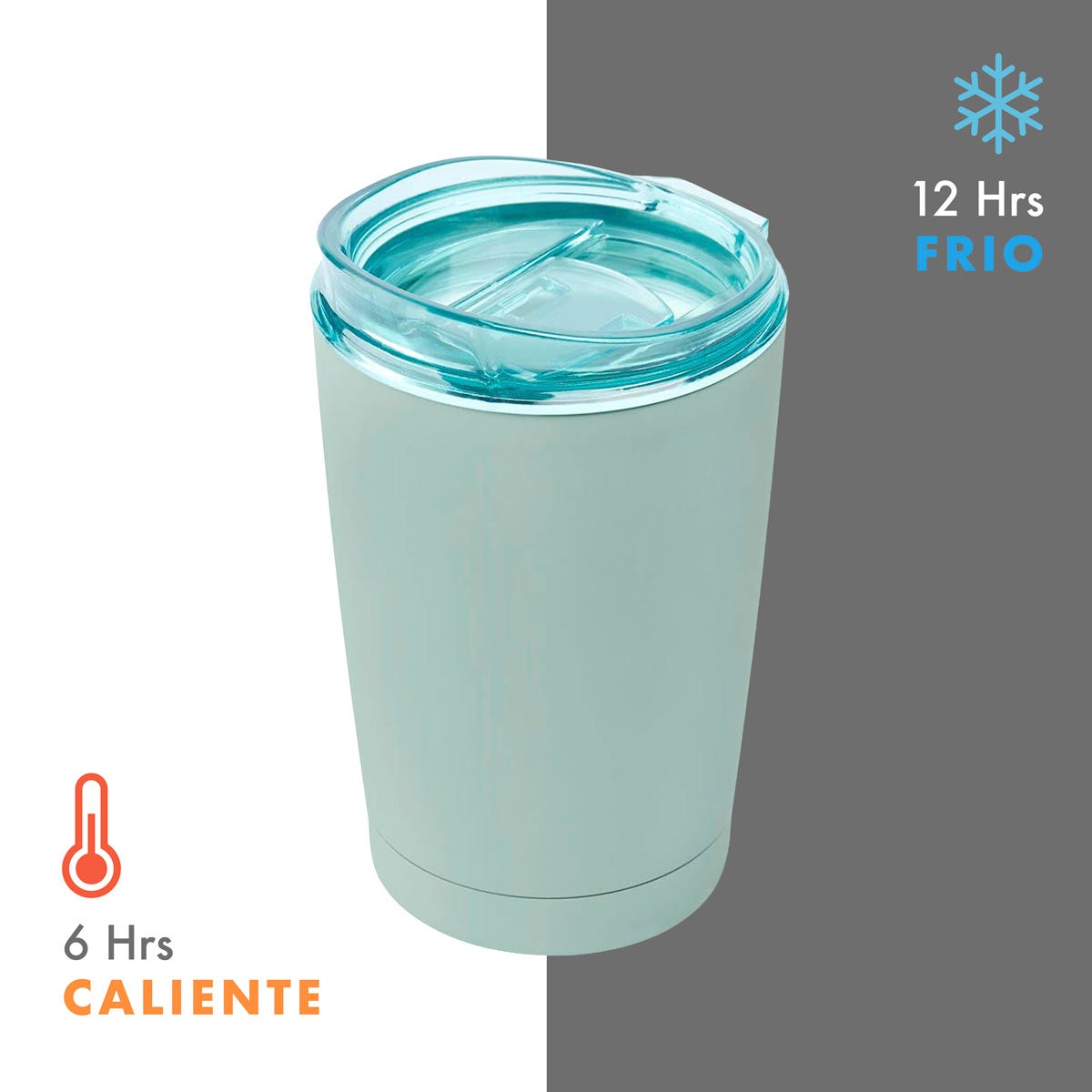 Termo doble pared. Cerrado al vacío. Pared interna y externa de acero inoxidable. Tapa de plástico con válvula de seguridad y diseño ergonómico en la boquilla. Su cuerpo con terminado rubber lo hace suave al tacto y ayuda a tener un mejor agarre. Mantiene la temperatura caliente 6 hrs y temperatura fría 12 hrs aproximadamente. Capacidad de 12 Oz. Base de 7.2 cm de diametro Incluye caja individual.