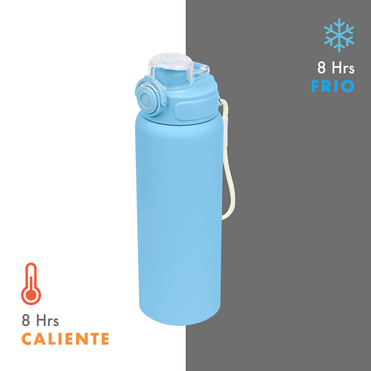 Termo doble pared. Cerrado al vacío. Pared interna y externa de acero inoxidable. Cuerpo con terminado tipo rubber, que lo hace suave al tacto. Tapa con cierre de rosca y sobre tapa tipo push para mantenerla seguro y limpio. Además con su nuevo diseño de boquilla, ofrece dos alternativas de uso, para beber normal o por medio de popote, ambas en la misma boquilla, sin ranuras adicionales. Mantiene temperatura caliente y fría por 8 hrs. Capacidad 27 Oz. Incluye asa de poliéster, popote de plástico y caja individual.